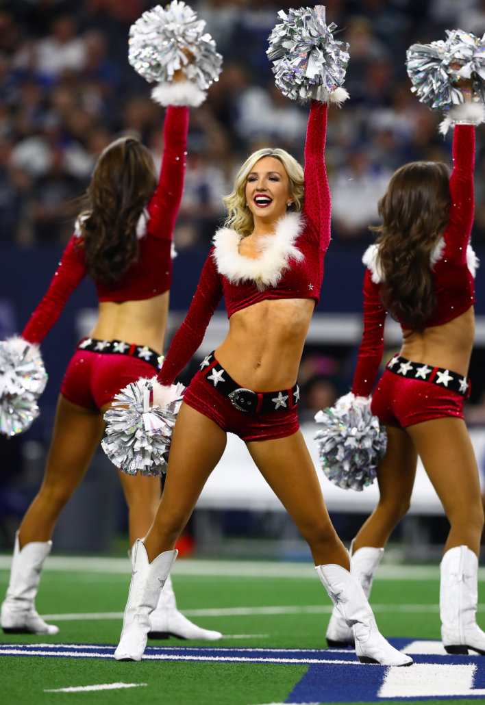 Dec 15, 2019; Arlington, TX, USA; Dallas Cowboys cheerleaders perform in holiday outfits during halftime of the game against the Los Angeles Rams at AT&T Stadium. Mandatory Credit: Matthew Emmons-USA TODAY Sports