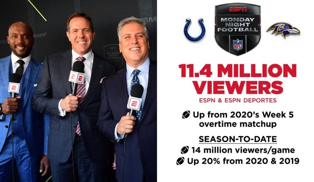 ESPN’s Monday Night Football presentation of the Indianapolis Colts at Baltimore Ravens (October 11, 8 p.m. ET) generated an audience of 11,375,000 viewers (ESPN and ESPN Deportes), an audience increase from the 2020 season’s Chargers-Saints Week 5 matchup (11,181,000 viewers on ESPN), which also went to overtime.