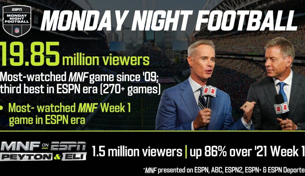 ESPN’s delivered its most-watched Monday Night Football game since 2009 and its third best Monday game in the current era (2006 – present and 270+ games), as 19,845,000 viewers – across ESPN, ABC, ESPN2, ESPN+ and ESPN Deportes – turned in for the Seattle Seahawks’ victory over the Denver Broncos in quarterback Russell Wilson’s return (September 12, 8:15 p.m. ET).